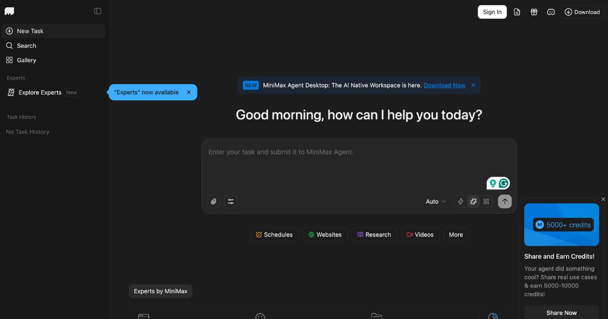 Minimax এজেন্ট হল একটি AI-চালিত সহকারী যা উৎপাদনশীলতা, সৃজনশীলতা এবং বিভিন্ন ডিজিটাল কাজ জুড়ে শেখার জন্য ডিজাইন করা হয়েছে। এটি জটিল কর্মপ্রবাহকে স্ট্রিমলাইন করার এবং দক্ষ টাস্ক ম্যানেজমেন্টকে সহজতর করার লক্ষ্যে বৈশিষ্ট্যগুলির একটি স্যুট অফার করে।