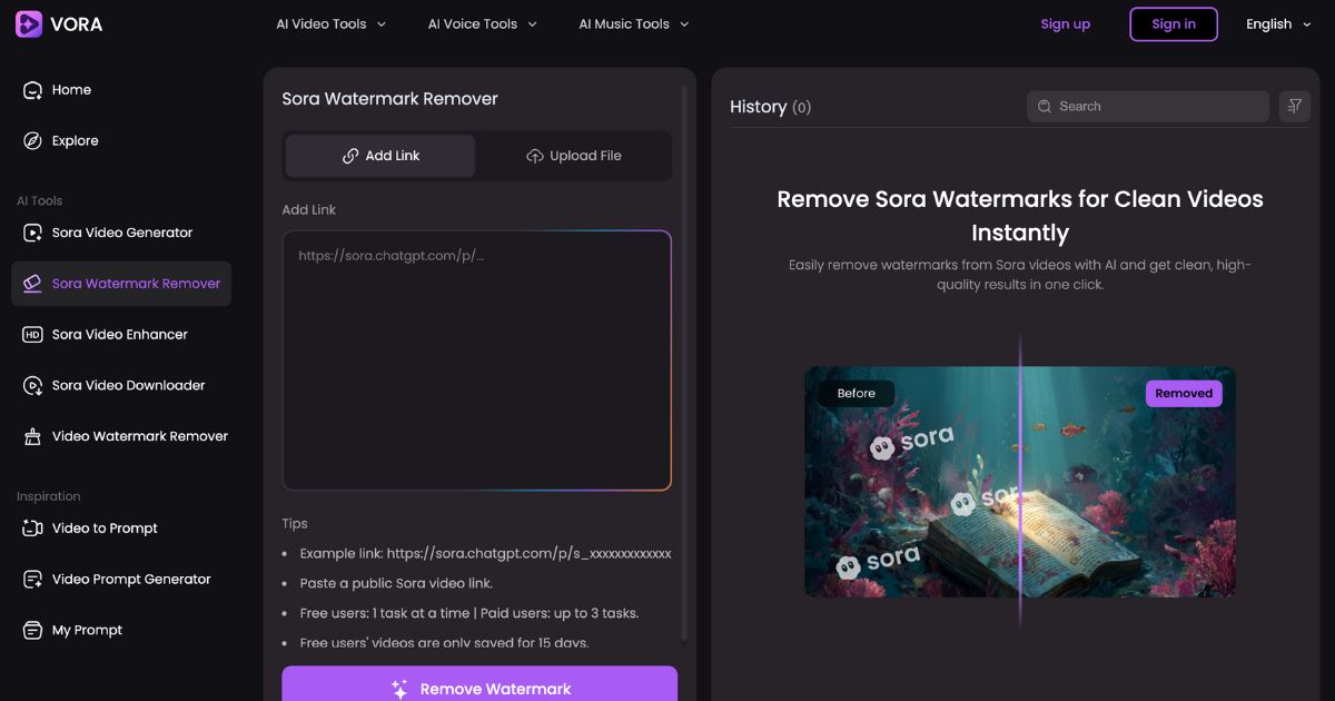 সোরা ওয়াটারমার্ক রিমুভার সোরা-উত্পাদিত ভিডিওগুলি থেকে ওয়াটারমার্ক মুছে ফেলার জন্য একটি সুবিন্যস্ত এবং দক্ষ সমাধান প্রদান করে৷ এর উন্নত AI প্রযুক্তি উচ্চ-মানের ফলাফল নিশ্চিত করে, এটিকে পেশাদারদের জন্য একটি মূল্যবান হাতিয়ার করে তোলে যারা পরিশীলিত এবং পেশাদার ভিডিও সামগ্রী উপস্থাপনের লক্ষ্য রাখে।
